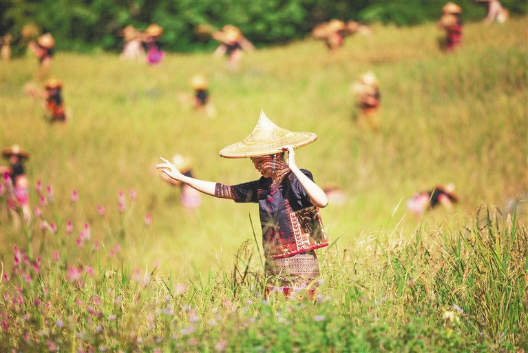 “砍山種植山蘭稻,一定要成功,煮好山蘭米,釀好山蘭酒,邀來親朋與好友,同慶好豐收……”當(dāng)天,在位于霸王嶺下的青松鄉(xiāng)擁處村的山坡上,一串串飽滿的稻穗已壓彎了稻稈;此時,農(nóng)戶們?nèi)褰Y(jié)伴爬上山坡,弓下腰身麻利地?fù)]動著手中的鉤刀開割稻稈,在辛勤勞作之時,還不忘哼起黎族歌謠分享著又是一年山蘭好收成的喜悅。山坡上辛勤勞作的喜悅,與正在山腳下舉辦的“啦奧門”山蘭文化節(jié)的喜慶氛圍達(dá)成了同一節(jié)拍。
