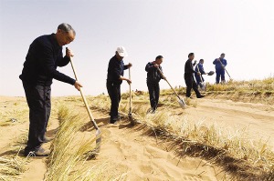 沒有治沙經(jīng)驗,他們就按“一步一叩首,一苗一瓢水”的土辦法栽種樹苗。然而,要想在沙漠中種活一棵樹談何容易?第一年,“六老漢”造林1萬畝,轉(zhuǎn)過年一開春,一場大風(fēng)過后,六七成的樹苗沒了。在林業(yè)技術(shù)人員的指導(dǎo)下,“六老漢”重拾信心,總結(jié)出“一棵樹,一把草,壓住沙子防風(fēng)掏”的治沙經(jīng)驗。慢慢地,樹苗的成活率上去了,漫天黃沙中顯現(xiàn)出點點滴滴的綠。
