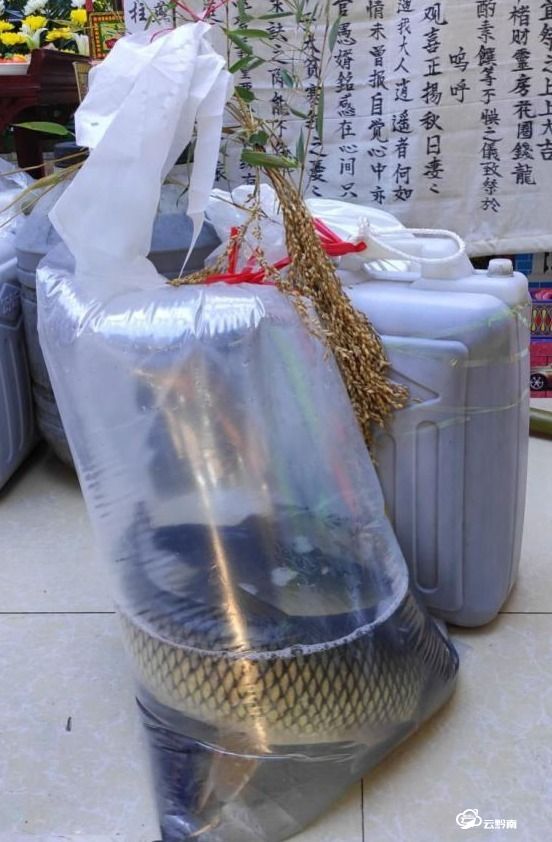 這幅圖片拍攝于都勻殯儀館,是在一位水族干部的葬禮上,三都水族自治縣九阡鎮(zhèn)的內(nèi)侄們從家鄉(xiāng)趕來(lái)憑吊姑父時(shí),送來(lái)了三條大活魚(yú)、一頭小豬、一壺米酒等物。水族有忌葷不忌魚(yú)的習(xí)俗,內(nèi)侄送魚(yú)表示與表兄弟姊妹一道忌葷,共同戴孝,共同守制;送來(lái)的小豬為堂祭犧牲,祭奠亡人。
