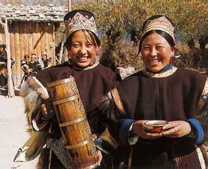 在工布地區(qū),不管是遠方的來客,還是常來常往的朋友,一踏進主人的新家,主人首先端出的是香噴噴的酥油茶。如果是尊貴的客人,還要被請到上座。招待來客時,主人會敬上酥油茶和青稞酒,尤其是青稞酒,主人要兩手棒著,恭敬地送到客人手上,客人喝一口,主人添一次,連續(xù)三次??腿俗詈笠豢跉獍驯械木坪韧?,這就是通常所說的三口一杯。如果客人推辭,主人還要獻上優(yōu)美動聽的酒歌,以此來表達主人的熱情和對客人的尊敬,直到客人把杯中的酒喝完為上。手捧酒杯,主人依次要給所有的來客敬上一遍。杯杯醇酒,盛滿了工布人的情和意。那情景,常令在場的人感動不已。