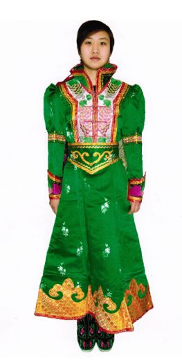 科爾沁蒙古袍款式較合身,長袍下擺窄且開衩。格外注重刺繡裝飾、穿偏開襟長坎肩、工藝精湛的尖頭靴和已婚婦女發(fā)髻式珊瑚頭飾等是科爾沁服飾最顯著的特征。
