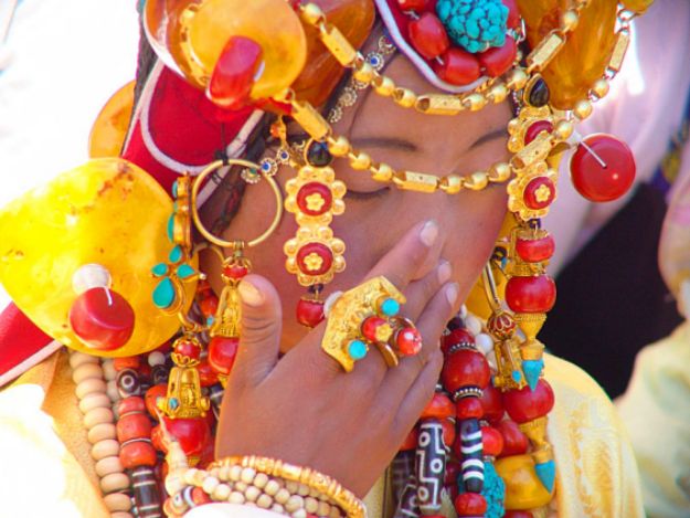 玉樹藏族服飾中,無論男女都喜歡戴手鐲。有象骨、金銀和玉鐲等多種,還有天珠、珊瑚、綠松石、象骨珠串成的腕飾。男女戒指多為金銀銅制的鞍形藏式戒指,嵌有紅珊瑚、瑪瑙、天珠、綠松石等各類珠寶。耳環(huán),男女都戴,男戴左不戴右,女戴雙耳環(huán),金銀銅制多種,多鑲嵌有各類珠寶。