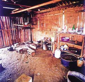 房?jī)?nèi)一般隔成里外兩間,里間狹小,光線暗,是主人的臥室,只放雙人床和一小部分生活用品。外間寬大,是生火煮飯、聚會(huì)待客和子女就寢的地方?;鹛猎O(shè)在里間屋的門外,放鐵制三腳架,三腳架對(duì)應(yīng)的方位有固定的用途,即靠里間房門一方為主人的座位,靠外間房門一方為客人的座位,火塘上方靠墻處為子女的床位。如有成年子女和新婚夫婦,則在外間再隔出小間,里間和外間存放著生產(chǎn)用具和酒具。房?jī)?nèi)幾乎沒(méi)有什么家具和裝飾性的陳設(shè),有的甚至沒(méi)有桌椅和床鋪,只在火塘周圍鋪著竹席或木板,合衣向火而眠。火塘上面1米多高處懸掛著竹編的約1米見(jiàn)方的架子,上面放著食具、鹽巴、辣椒等,也是烘烤牛肉干的地方。架子上面靠房頂處并排放著幾個(gè)粗大的竹筒,里面存放糧食。這幾年的新村民居,在保持傳統(tǒng)民居特征的前提下使用了新型建材,更堅(jiān)固,更舒適。