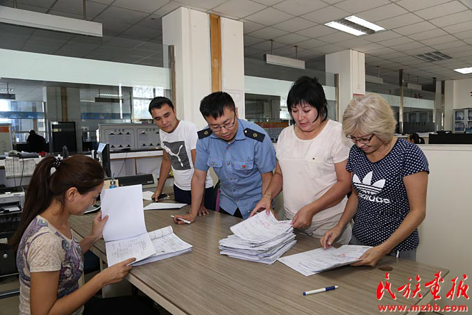 中哈兩國鐵路人員在阿拉山口口岸進(jìn)行貨物交接驗收(滕俊 攝影)