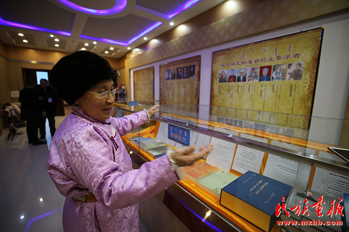 其木格老人向參觀者介紹正藍(lán)旗方言被確定為中國蒙古語標(biāo)準(zhǔn)音的歷史