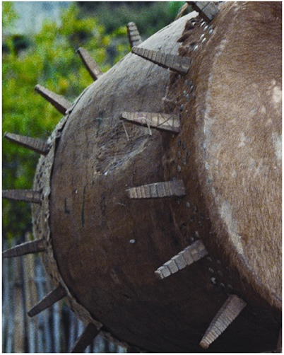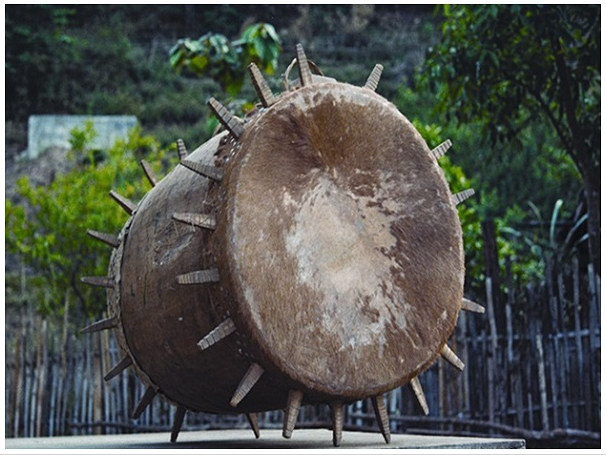 民族文化宮博物館藏基諾族木質(zhì)皮鼓,鼓面直徑55厘米,高88厘米,長約130厘米,20世紀八十年代征集于云南省西雙版納州景洪縣基諾鄉(xiāng)。鼓身為木質(zhì),呈圓柱形,兩端對稱。鼓有兩面,用牛皮蒙制。兩端鼓面邊緣各環(huán)繞嵌有花紋的上方下錐形的木棍(一側17根,另一側為20根),木棍長15厘米。鼓身兩側有方形孔,為鼓的音孔,上部有兩個把手,用于系繩懸掛木鼓。因鼓面兩端邊沿嵌有數(shù)十根鼓釘,形似太陽放射出的光芒,也稱為“太陽鼓”。