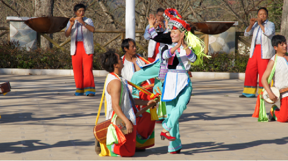 大三弦舞又叫“阿細跳月”,流傳于云南撒尼和阿細民間的一種舞蹈。據(jù)傳大三弦舞來源于刀耕火種時代。跳這種舞時,男子一字排開,彈著三弦或吹著笛子跳。隨著節(jié)奏抬腳踢腿,向前退后、向左向右交換舞步。女青年亦一字排開,腿上的動作與男青年一致。不同的是女青年要拍手,原地跳一段節(jié)奏,由左向右轉一個圈,輪回反復。有時男子向前沖,女子向后退,富有情趣。