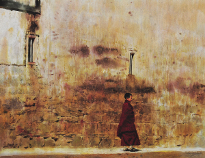 在麗江的束河古鎮(zhèn),他坐在小溪邊,吹著清涼的微風(fēng),聽著對面咖啡屋傳來的低吟慢唱,心情舒暢地畫著自己的畫。很快,一幅《水邊咖啡屋》就在這不經(jīng)意間誕生了。在梅里雪山,早晚都能看到人們所說的日照金山的美景,打開窗戶,暖陽透進(jìn)來照在身上,就這樣畫著藏族人心中的神山,他覺得實在找不出還有比那一刻更美好的感覺了。
