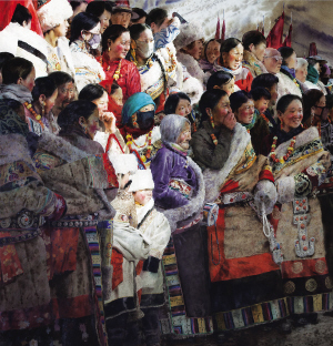 12月15日,第12屆全國美術(shù)作品獲獎暨獲獎提名作品展將在中國美術(shù)館開幕。在第12屆全國美展中斬獲水彩/粉畫類唯一金獎的《亮寶節(jié)上的人們》,也將在大展中亮相?!读翆毠?jié)上的人們》描繪了藏族群眾過亮寶節(jié)的情景,畫面人物眾多,色彩斑斕,氣氛莊重。此畫是畫家許海剛連續(xù)3年春節(jié)到藏族聚居區(qū)過亮寶節(jié)的所聞所感的沉淀,傾注了其一腔深情。