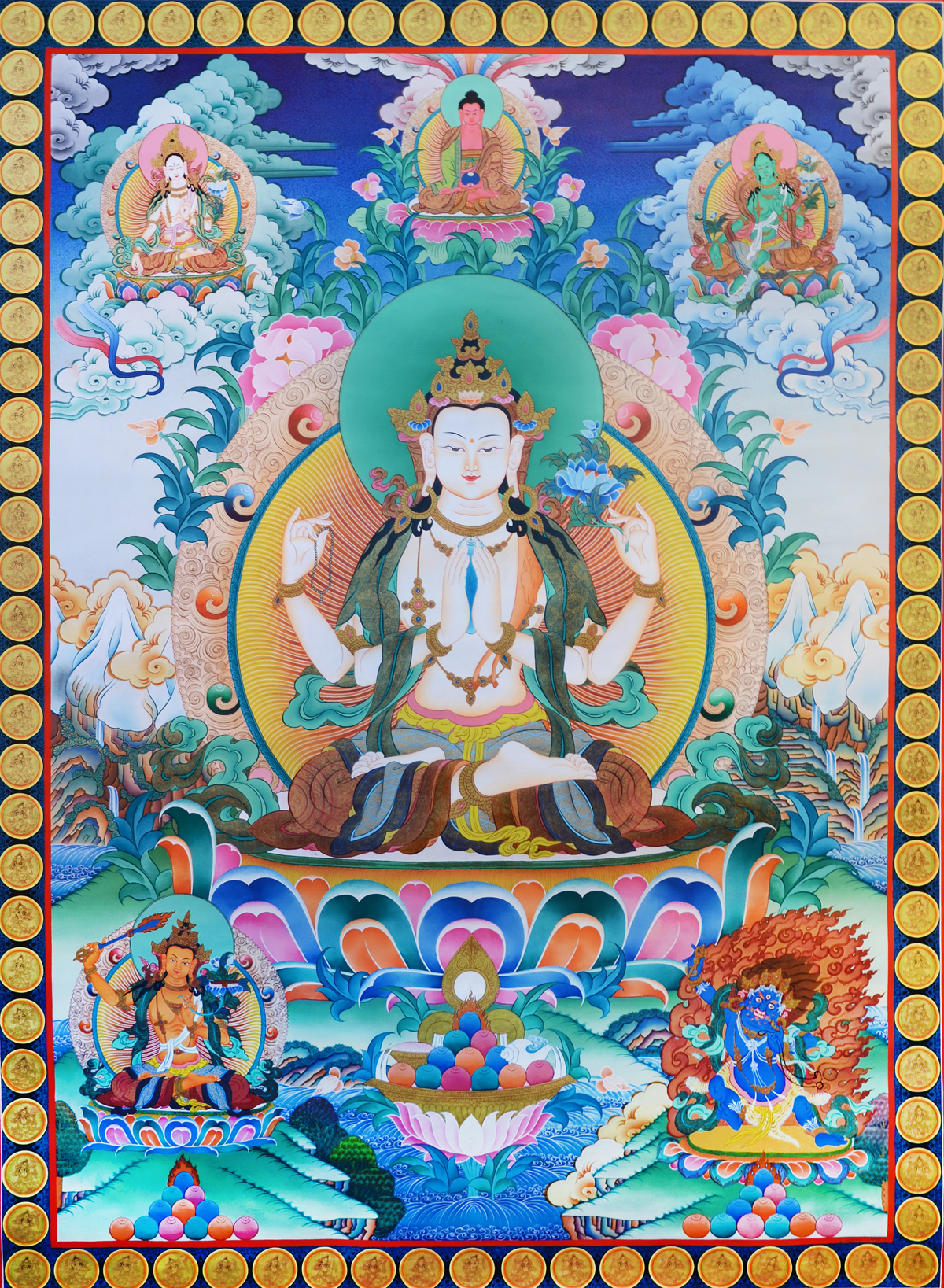 四臂觀音是雪域西藏的守護(hù)神,藏人由老至幼家家戶戶,皆吟誦其六字大明咒:“嗡嘛呢叭咪吽”。四臂觀音輿文殊菩薩、金剛手菩薩,合稱三族姓尊.代表大悲、大智、大力,為密乘行者人人必修的法門。