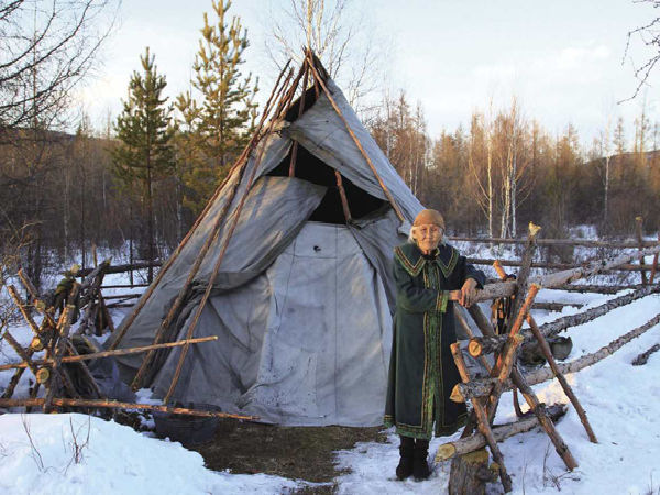 撮羅子的選址,是在地勢(shì)較高、陽(yáng)光能照射到而且水和柴草就近可取的平坦之處。其蓋造方法,是用三五根約碗口粗細(xì)上有枝杈的木桿,相互交合搭成上聚下開(kāi)的骨架,然后再用30根左右木桿搭在骨架之間捆綁固定,在南面(或東面)留出門(mén),即基本成型。木桿搭起的只是“屋架”,外面還要覆蓋才能遮風(fēng)擋雨。按照季節(jié)的不同,分別用樺樹(shù)皮、草簾子和犴、狍等獸皮,做成自上而下一層壓一層的圍子,綁在木桿上,門(mén)簾則夏用草或樹(shù)條編,冬用狍皮做成。