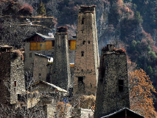 在羌語(yǔ)中,碉樓被稱為“邛籠”,意為美麗、高貴的房子,早在2000年前《后漢書·西南夷傳》就有羌族人“依山居止,壘石為屋,高者至十余丈”的記載。碉樓的高度在十米至三十米之間,用于御敵、貯存糧食和柴草。碉樓有四角、六角、八角幾形式,有的高達(dá)十三四層。建筑材料是石片和黃泥土,墻基深1.35米,以石片砌成。石墻內(nèi)側(cè)與地面垂直,外側(cè)由下而上向內(nèi)稍傾斜。修建時(shí)不繪圖、吊線、柱架支撐,全憑高超的技藝與經(jīng)驗(yàn)。建筑穩(wěn)固牢靠,經(jīng)久不衰。自唐朝來(lái),羌族人民因各種原因向西北遷移,到了西藏和青海,所以現(xiàn)在,羌族碉樓也往往被稱為藏族碉樓。