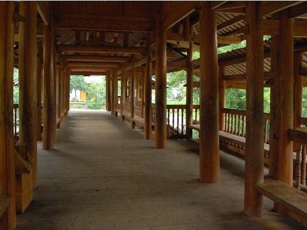 風(fēng)雨橋以石拱木作,廊、屋、亭、閣為一體,造型別致、美不勝收。無論是遠眺還是進觀,都體現(xiàn)出獨特的審美意境。鏈接廊橋與屋亭的是長條青石,橋與村寨的連接則用花石鋪路,橋面主體是當(dāng)?shù)厮寄静?。這種自然生態(tài)環(huán)保的理念,更彰顯了瑤族人民獨特的審美境界。
