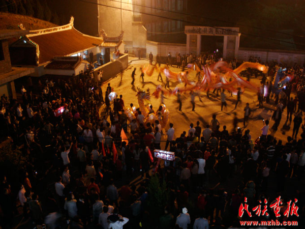晚上十點(diǎn)半,在農(nóng)村,這已經(jīng)可以算作深夜了。但承啟樓門前依然聚滿了人,其他地區(qū)舞龍隊(duì)的不斷光臨讓這里也是鞭炮聲不斷。雖然累,從高南返回承啟樓的舞龍隊(duì)隊(duì)員們依然興奮不已,他們在樓前的馬路上攔住過往的其他村舞龍隊(duì),要求共舞一場。