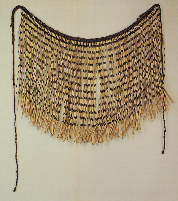 博嘎爾婦女穿一種叫“基都”的短上衣。用野麻織成的土布縫制,其樣式為無領(lǐng)、短袖、對襟。下部穿用羊毛織成的粗呢緊身筒裙,稱作“結(jié)邦”。小腿部扎裹腿,叫“涅蘇木”。條件好的人家外面還會罩一件稱為“階納布”的披肩。希蒙部落的婦女穿當(dāng)?shù)孛藁棾傻陌咨蛩{(lán)色的寬大對襟短上衣。下身穿筒裙,裙子下擺較寬,上面織有黃紅色或黃黑色的簡單圖案(圖為民國時期的珞巴族草裙,中央民族大學(xué)民族博物館館藏)。