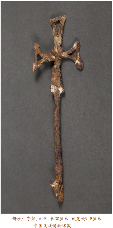 眼前此件在內(nèi)蒙古達(dá)茂旗出土的元代鎏金青銅十字架,四面排列有浮雕金剛杵紋,其正面每個(gè)金剛杵圖案上均有鎏金裝飾,十字架上部穿孔則可用于懸掛。金剛杵是藏傳佛教里的修行法器,象征力量與智慧;而十字架則是基督教文化的標(biāo)志,如此混搭,歷史便要傳遞出種種:在信仰藏傳佛教的蒙古高原,金剛杵,象征無畏圓滿,十字架,則代表救贖重生,東西方文化的結(jié)合亦呈現(xiàn)某種文明可能達(dá)到的無可比擬之高度。
