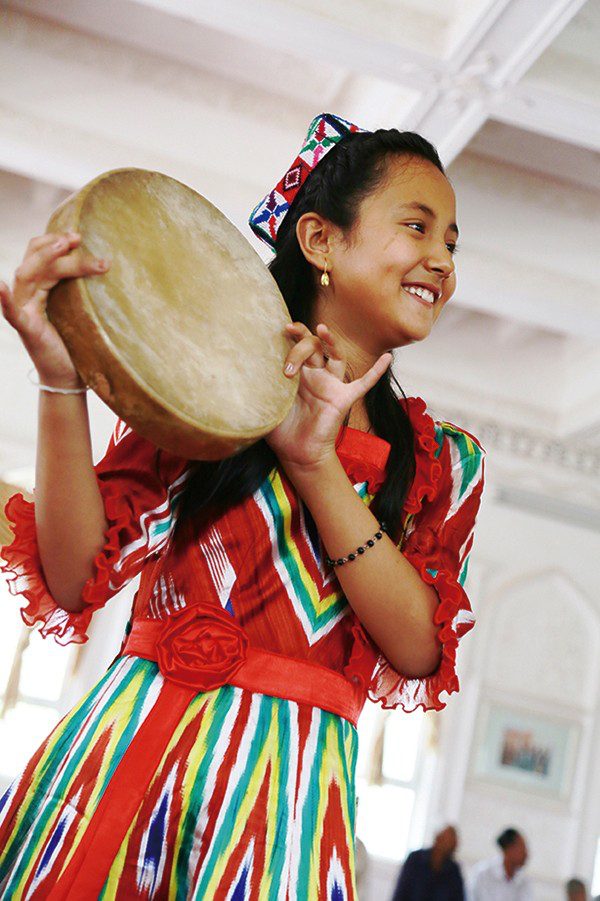 11歲的麥迪娜是小學(xué)五年級(jí)的副班長,在麥蓋提一小雙語班讀書,漢語好到可以給我做翻譯,向老藝人提問。麥迪娜的世界已經(jīng)和老藝人、和叢林中艱難漁獵的祖先不一樣了。她在麥西來甫中敲達(dá)甫手鼓,在活動(dòng)中心學(xué)習(xí)電子琴,是女子“手鼓樂隊(duì)組合”中8位11—3歲女孩子中的一個(gè)。她希望將來能在北京上學(xué)、成為醫(yī)生治好奶奶的糖尿病。她會(huì)用漢語唱國歌和《歌聲與微笑》,還有《茉莉花》,雖然吐字與調(diào)子不太那么準(zhǔn)。她圍著阿布都克萊姆(被稱作“維吾爾人的趙本山”的維吾爾族諧星)索要簽名的同時(shí),還喜歡羅志祥,以韓國偶像組合EXO為榜樣。麥迪娜還上過電視,常有喀什地區(qū)的、自治區(qū)的、全國的媒體到麥蓋提來采訪、錄制刀郎麥西來甫。