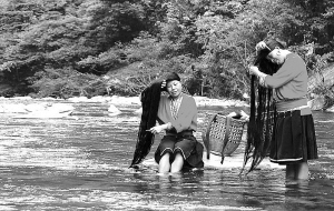 在村旁的一處小溪邊,我看到許多瑤妹們?cè)谑嵯粗活^長發(fā),就用相機(jī)拍下這美麗的畫面。突然,村子里一陣騷動(dòng)聲,原來是村里為游客舉辦的相親、拜堂的互動(dòng)節(jié)目開始了。幾個(gè)游客裝扮成“新郎”,感受著瑤族傳統(tǒng)的婚禮儀式。紅瑤婦女的長發(fā)不僅為當(dāng)?shù)貛砹寺曌u(yù),也成了村里意想不到的經(jīng)濟(jì)收入來源。婦女們利用長發(fā)梳妝結(jié)合當(dāng)?shù)孛袼妆硌?,接待了來自世界各地的許多游客。