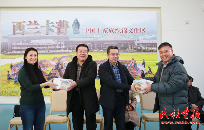魯迅文學院副院長邢春(左一)、培訓部主任王冰(右一)代表魯迅文學院向中國民族博物館和中國婦女兒童博物館分別贈送了《中國少數(shù)民族文學作品叢書》