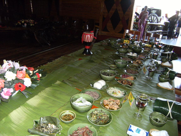 景頗族飲食大多帶有亞熱帶山林地區(qū)的特色和耕牧漁獵的民族文化氣息,如舂鱔魚、螺螄湯、酸筍燒魚、竹筒烤魚、砂鍋燉竹鼠、涼拌牛肚、煮芋頭、臭豆、酸木瓜炒牛肉絲、帕滾菜煮繁雞、水腌菜拌烤山鴿、鹿肉剁生、馬鹿干巴肉松、油炸知了肉丸、螃蟹夾、粘棗果、煮酸粑菜、軟米銅鍋飯等。特色菜酸筍燒魚烹飪時先將油燒至七成熱,放入洗凈去鰓的魚,炸至呈金黃色撈出控油。然后又在鍋中注入油,用蔥、姜、蒜熗鍋,烹入料酒、醬油、高湯,沸后下魚、酸筍、辣椒、味精、鹽、白糖、胡椒,收至汁濃時裝盤。舂鱔魚將鱔魚去頭去內(nèi)臟,蒜、姜拍松,香菜、荊芥切成末,鱔魚用炭栗火燒成金黃色,辣椒炒熟透,切成米粒。最后將鱔魚舂細,放入配料,調(diào)料舂細裝盤。