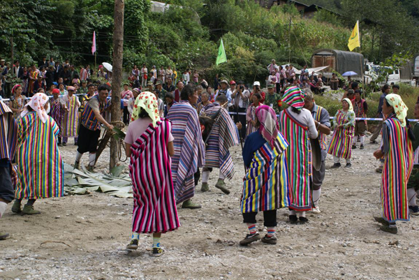 獨龍族的舞蹈多為祭祀性舞蹈,均為集體舞和“納目薩”跳的單人舞,隊形只有兩橫排交叉和逆時針方向圓舞兩種。剽牛舞是最具代表性的舞蹈,在不同的時間、場合用于不同的祭祀對象,在不同的村寨、不同的祭祀場合中,有不同的稱謂。