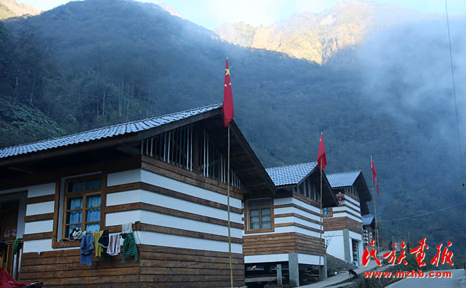 國家大力支持發(fā)展獨龍族社會事業(yè),真正為獨龍族百姓謀福利。獨龍族居民房屋前,家家掛著鮮艷的五星紅旗