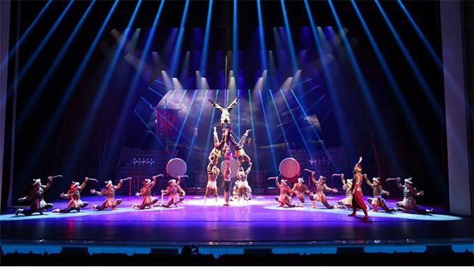 雜技是這部劇的一大亮點(diǎn)。新疆生產(chǎn)建設(shè)兵團(tuán)雜技團(tuán)近年來編創(chuàng)了《天鵝湖—男子倒立技巧》《向太陽—繩技》《春之韻—女子造型》等多個(gè)精品節(jié)目,并在國內(nèi)外重大雜技賽場多次獲獎(jiǎng)。《樓蘭尋夢》中,主創(chuàng)團(tuán)隊(duì)將這些獲獎(jiǎng)節(jié)目進(jìn)行拆解,將蹬鼓、獨(dú)輪車、吊環(huán)、肩上芭蕾、水流星及舞中幡等雜技技巧與戲劇元素相融合,讓觀眾猶如置身于黃沙漫漫的絲路古國。