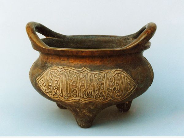 侈口、方唇、窄卷沿、矮束頸、扁鼓腹,口沿立一對(duì)橋形耳,底部以矮小的三乳足支撐整個(gè)爐身。外腹壁兩大兩小四組開(kāi)光內(nèi)均以珍珠紋為底,陽(yáng)刻有阿拉伯文字,漢譯為:“最貴的記主詞(吉克爾)是念清真言(萬(wàn)物非主,唯有真主,穆罕默德是真主的使者)”,底款漢文四字篆書(shū)“宣德年制”。阿拉伯文構(gòu)成此爐的主體紋飾,圖案別致,內(nèi)涵深?yuàn)W,寓意獨(dú)特,雕刻手法精細(xì)、嫻熟,線條婉轉(zhuǎn)流暢,自然雅致,具有韻律之美。該器物銅質(zhì)精良,造型優(yōu)美,工藝考究,將冶鑄、雕刻技術(shù)與阿拉伯文書(shū)法絕妙融合,堪稱(chēng)回族文物中的珍品。
