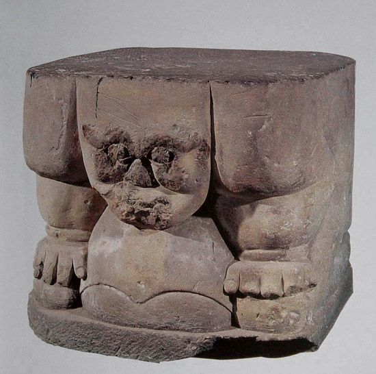 圓雕,白砂石質(zhì),近似正方體。圓雕男性人像,面部渾圓,顴骨高突,粗眉上翹,雙目圓睜且外突,鼻梁短粗,獠牙外露,下頜置于胸前,裸體,腹有肚兜,肩于頭齊,肘部后屈,雙手扶膝,下肢屈跪,背部平直。座頂左上角陰刻西夏文三行,計(jì)15個(gè)字。第一行4字漢譯為“小蟲(chóng)曠負(fù)”;第二行4字漢譯為“志文支座”;第三行7字漢譯為“瞻行通雕寫(xiě)流行”。背部陰刻漢文一行6字“砌壘匠高世昌”,為西夏石雕工匠的姓名,彌足珍貴。雕像以夸張的手法表現(xiàn)了負(fù)重者的神態(tài),反映出西夏時(shí)期石雕藝術(shù)的獨(dú)特風(fēng)格。迄今在西夏陵區(qū)多座帝陵的碑亭遺址中,已出土這類(lèi)支座14件,但刻有西夏文字的僅此一件。