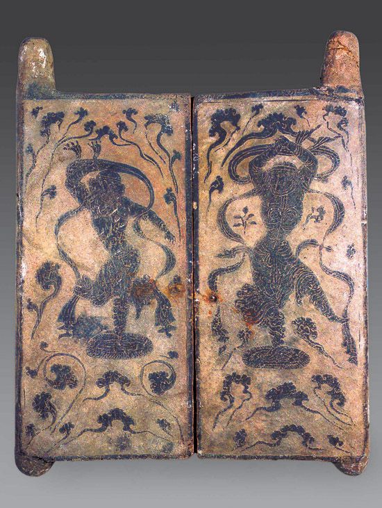 每扇門(mén)均呈長(zhǎng)方形,上下有圓柱狀榫,兩門(mén)閉合處各有一孔,出土?xí)r有鐵鎖鎖扣。每扇石門(mén)正中淺雕一“胡旋舞”男伎。所刻男伎為典型的胡人形象:虬髯卷發(fā),深目高鼻,寬肩細(xì)腰,體魄健壯。身著圓領(lǐng)緊身窄袖衫,下著緊腿裙,腳穿長(zhǎng)筒皮靴,站立在一塊編織精美的小圓毯上,雙人對(duì)舞。舞姿造型略有不同,左邊舞伎側(cè)身回首,左腳站立圓毯上,右腿后屈,左手正微微上舉,右臂屈至頭頂;右側(cè)男伎右腳立毯上,左腿前伸,雙臂上屈,至頭頂上方合攏。兩人均手舉長(zhǎng)巾,熟練揮旋。四周剔地淺浮雕卷云紋,似舞伎騰躍于云氣之中,造成流動(dòng)如飛的藝術(shù)效果。整個(gè)畫(huà)面構(gòu)思精妙,主題突出,人物面部表情生動(dòng)自然,體態(tài)輕盈健美,舞姿迅疾奔放、充滿(mǎn)歡樂(lè)生活氣息。