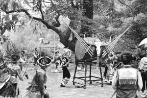 每年農(nóng)歷正月初二至十五花山節(jié),主人與遠(yuǎn)道而來的客人共同歡慶。他們圍成一圈,喝著燒酒,跳起歡快的苗家舞蹈,唱著動聽的民歌,一天的勞頓、一年的艱辛,被熱烈的燒酒驅(qū)趕著,被歡愉的歌舞浸潤著,被悠揚(yáng)的蘆笙旋律激蕩著。蘆笙、燒酒、蠟染,精美古樸的苗族服飾,木槽里錘打的糍粑……與四周山山水水一同融匯,幻化成一個民族的標(biāo)識。
