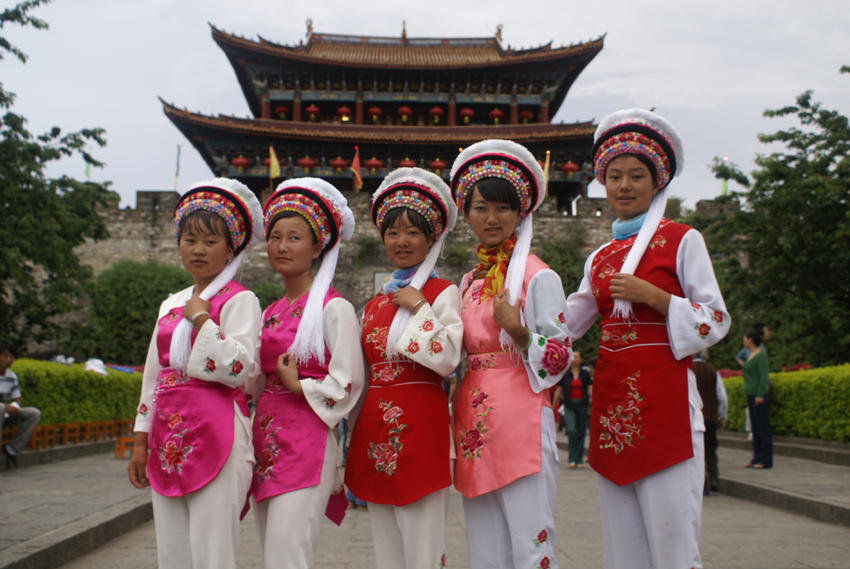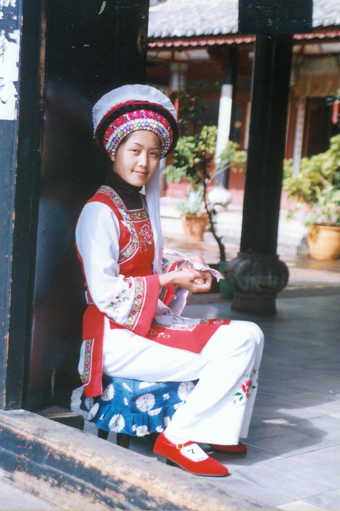 一直以來(lái),享有“金花”美譽(yù)的白族婦女的服飾,更是色澤鮮美、絢麗多彩。大理一帶的婦女多穿白上衣、紅坎肩或是淺藍(lán)色上衣配絲絨黑坎肩,右衽結(jié)紐處掛“三須”“五須”的銀飾,腰間系有繡花飄帶,下著藍(lán)色寬褲,腳穿繡花的“白潔鞋”。手上多半戴紐絲銀鐲、戒指。已婚婦女梳發(fā)髻,未婚少女則垂辮或盤(pán)辮于頂,有的則用紅頭繩纏繞著發(fā)辮下的花頭巾,露出側(cè)邊飄動(dòng)的雪白纓穗,點(diǎn)染出白族少女頭飾和發(fā)型所特有的風(fēng)韻。劍川一帶的年輕女子則又喜戴小帽或“魚(yú)尾帽”。洱源西山及保山地區(qū)的白族婦女常束發(fā)于頂,上插銀管,再以黑布包頭,穿右襟圓領(lǐng)長(zhǎng)衣,系繡花腰帶,衣袖和褲腳喜鑲繡各色寬窄不同的花邊,有的還喜束護(hù)腿,顯得十分勻稱協(xié)調(diào)和俊俏美觀??傊?,各地白族的服飾雖呈現(xiàn)出某些地區(qū)性的差異,但都色彩明快、映襯協(xié)調(diào)、挑繡精美、古雅端莊。