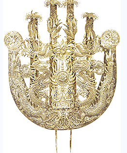 而最為極致的演繹,則要屬黔東南地區(qū)的苗族“盛飾”:黃平苗族的球形銀鳳冠,銀冠之上布滿銀花,蝴蝶、螳螂、雀鳥(niǎo)等動(dòng)物形象立于花間,一派生機(jī)。銀冠下緣飾有響鈴,行動(dòng)時(shí)搖曳生姿、聲色俱美;雷山西江苗族的大銀角,寬近1米,立高可達(dá)70厘米左右,面上鏨刻有雙龍搶寶的主紋,兩端尖角處可插羽毛或彩線,中央插有一把銀扇,既像鳥(niǎo)羽,又似太陽(yáng)放射出的光芒……