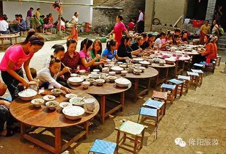 男方家也得請客。新郎啟程去接新娘子,家里馬上就殺雞做飯,新郎新娘回來后要吃染成黃色的糯米飯和雞肉,表示往后生活美滿幸福,像糯米飯一樣結成團永不分開。晌午時分,是新郎家待客最熱鬧的時候,幫廚的人擺上各種酒菜,親朋寨鄰老老少少全坐到天井里,歡歡鬧鬧地吃飯。最后,客人們有的陸續(xù)走了,愿留下的湊攏幾桌,邊喝酒邊暢談,一直要吃到第二日還不歇。