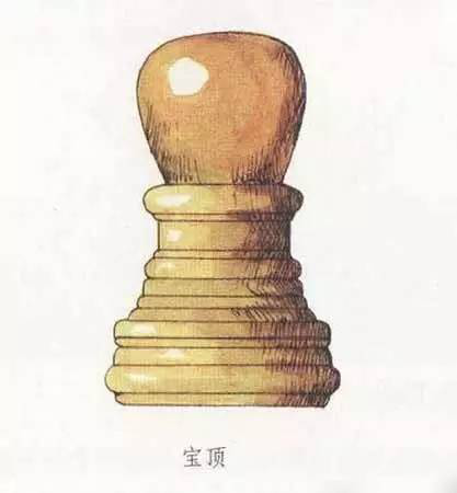 在建筑物的頂部中心位置,尤其是攢尖式屋頂?shù)捻敿馓?,往往立有一個圓形或近似圓形之類的裝飾,它被稱為寶頂。在一些等級較高的建筑中,或者確切地說,在皇家建筑中,寶頂大多為銅質鎏金材料制成,光彩奪目。