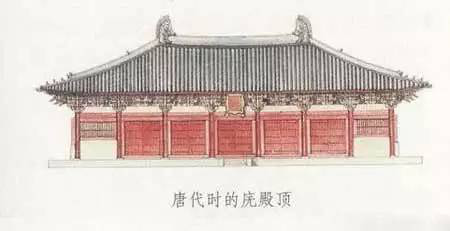 根據(jù)資料與記載,廡殿頂屋頂早在殷商時代就已出現(xiàn)。不過,現(xiàn)在對唐代中期以前的廡殿式屋頂?shù)木唧w結構已無從得知,晚唐以后漸有實例可查。其形象是屋面平緩,正脊較短。正脊兩端為鴟尾而不是鴟首。