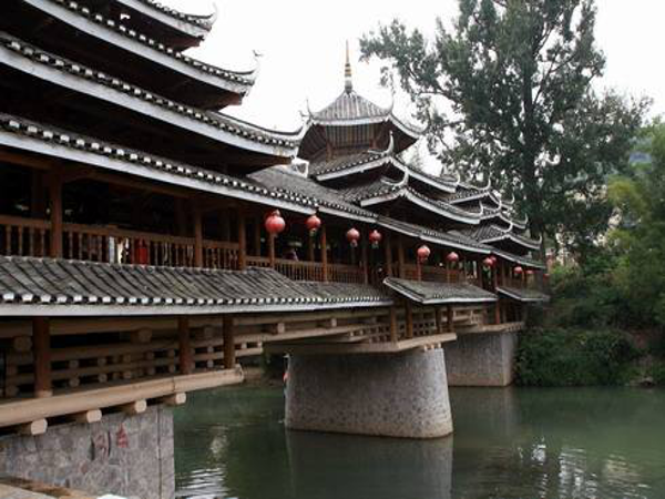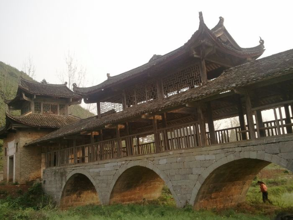 瑤族風(fēng)雨橋,又被稱之為“涼橋”或“風(fēng)水橋”。除木橋外,大多是在石拱橋上加蓋橋廊、橋亭和在橋頭的橋臺上建閣樓,穿斗式木構(gòu)架,二層檐或三層檐,有的四層檐,通高在9米~10米間。風(fēng)雨橋不僅是路人避雨之處,也是瑤族男女青年談情說愛的約會場所。廣西瑤族風(fēng)雨橋主要集中在富川瑤族自治縣和恭城瑤族自治縣。富川縣保存至今的古代瑤族風(fēng)雨橋有18座,其中著名的有迥瀾橋(建于明萬歷年間),青龍橋(與前者同時(shí)期修建),以及福壽橋、高橋、鳳溪新橋、皇侯泉橋、東轅橋、鸕鶿塘瀾通橋、龍歸橋、興隆橋等。