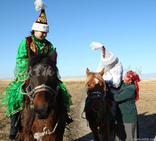 新娘唱完“闊爾斯”后,在伴娘的攙扶下,和親人們一一擁抱,揮淚告別。新娘離家時(shí),彩巾蒙頭,出門(mén)吻別父母,騎上最快最好的馬,同新郎并駕而行。遇有攔路的繩索,新娘必須下馬,向攔路的小伙子贈(zèng)送紀(jì)念品,否則,小伙子們會(huì)故意取鬧不放行。