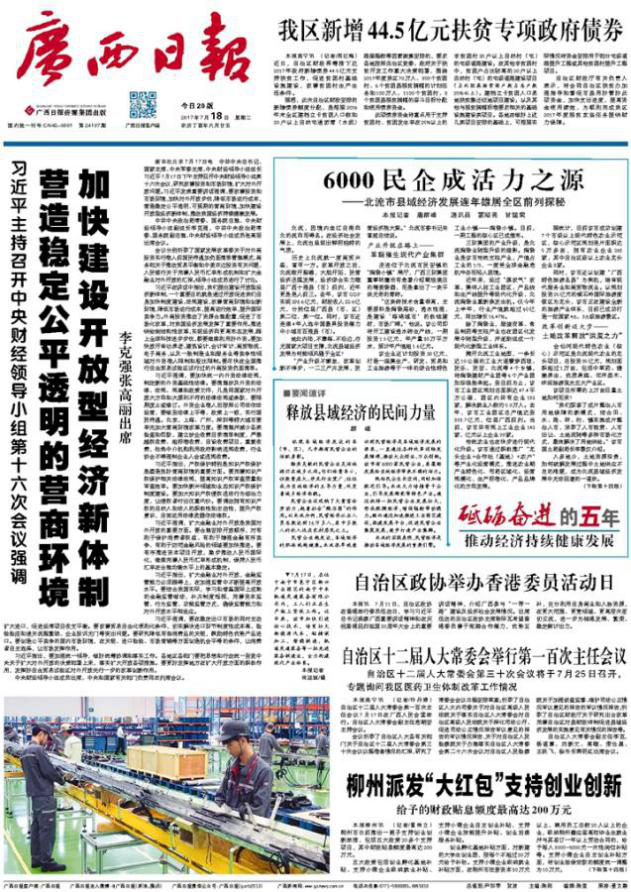 《廣西日?qǐng)?bào)》(Guangxi Daily)作為中共廣西壯族自治區(qū)委員會(huì)機(jī)關(guān)報(bào),以報(bào)道廣西重大新聞的權(quán)威性深得讀者看重,是廣西4800萬(wàn)人民了解國(guó)家以及廣西重大時(shí)政、經(jīng)濟(jì)、社會(huì)信息的重要媒體,同時(shí)也成為外界觀察了解廣西的重要窗口。