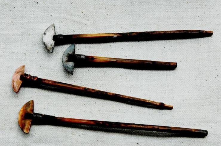 繪制蠟花的工具是一種特制的銅刀,而不是毛筆,因?yàn)槊P容易被蠟冷卻凝固。這種銅刀是用兩片或多片形狀相同的薄銅片組成,一端縛在木柄上。刀口微開而中間略空,以易于蘸蓄蜂蠟。根據(jù)繪畫各種線條的需要,有不同規(guī)格的銅刀,一般有半圓形、三角形、斧形等。蠟染的基本原理是在需要白色花型的地方涂抹蠟質(zhì)(古代是蜂蠟,現(xiàn)代是石蠟、蜂蠟、木蠟等混合蠟),然后去染色,沒有涂蠟的地方染成藍(lán)色,有蠟的地方呈現(xiàn)白色,行話叫做“留白”。