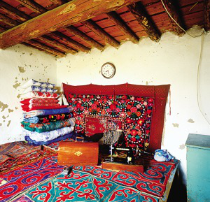 新疆維吾爾自治區(qū)木壘縣大南溝烏孜別克民族鄉(xiāng)鄉(xiāng)政府為烏孜別克牧民集中興建了定居房。新村街道整齊,土墻圍成的院落獨(dú)門獨(dú)院。院落很大,前院種菜栽樹,有水井,房后是牛欄羊圈。有的還單建了廂房作廚房。這里的住房都是長(zhǎng)方形土坯平頂房,玻璃窗,墻壁很厚,冬暖夏涼。屋內(nèi)橫梁和走廊的木柱、木梁上有的是工筆重彩的花紋圖案,有的用雕花石膏鑲嵌或磚、木雕刻后鑲嵌,做工精細(xì)。墻壁上有整齊排列的拱形壁龕,里面擺著日用品和工藝品,四周也鑲嵌著花紋圖案。居民們住板炕,在屋里地上挖一小坑,坑內(nèi)放置火爐,鐵皮煙囪通向室外,坑上橫搭木板成板炕,板炕上鋪花氈坐毯??繅σ贿厰[著疊得整齊的被褥,繡花枕頭對(duì)稱地立在被褥上。墻上掛著壁毯,整個(gè)室內(nèi)既有局部美,又有整體美,賞心悅目。