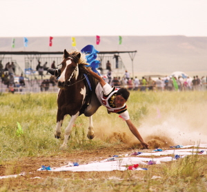 9日,在錫林郭勒盟阿巴嘎旗草原上,蒙古族選手們表演的騎馬射擊、騎馬射箭和騎馬拾哈達(dá)(即“馬上三藝”),讓來(lái)自俄羅斯、蒙古國(guó)、德國(guó)、臺(tái)灣等地的游客大開(kāi)眼界。