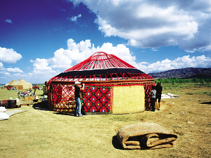 氈房外觀通常樸實(shí)無華,門框由松木做成,上面雕刻花紋或繪制圖案,一塊鮮艷奪目的掛毯吊在門上。房內(nèi)富麗堂皇,布置合理,前半部分堆放日用物品,后半部分待客、住人。