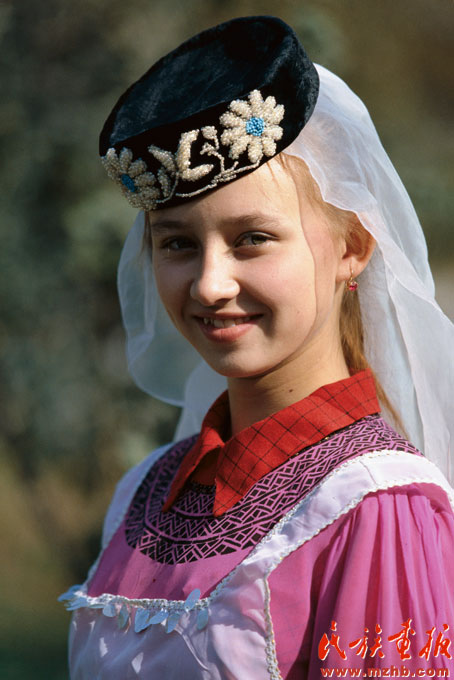 塔塔爾族的婚俗別具一格。按塔塔爾人的傳統(tǒng)習(xí)慣,婚禮在新娘家舉行,即先把新郎“嫁”出去,然后再“娶”回來。婚姻過程主要經(jīng)歷提親、相親、訂婚、納聘、嫁新郎、娶新娘六個過程(塔塔爾族少女。引自民族畫報)。