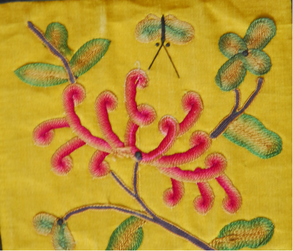 1.平針繡,又稱“直針”,是滿族枕頂刺繡最基本的針法之一,它能準(zhǔn)確地表達(dá)植物花卉、動(dòng)物禽獸、人物、器物等。在所有針法中,平針是分布最廣、使用范圍最大的針法。它的運(yùn)針方式是起針、落針都在圖案的輪廓邊緣,針腳排列均勻,線跡平行,不重疊交錯(cuò),紋樣之間的線條靠空出地面來表現(xiàn)。