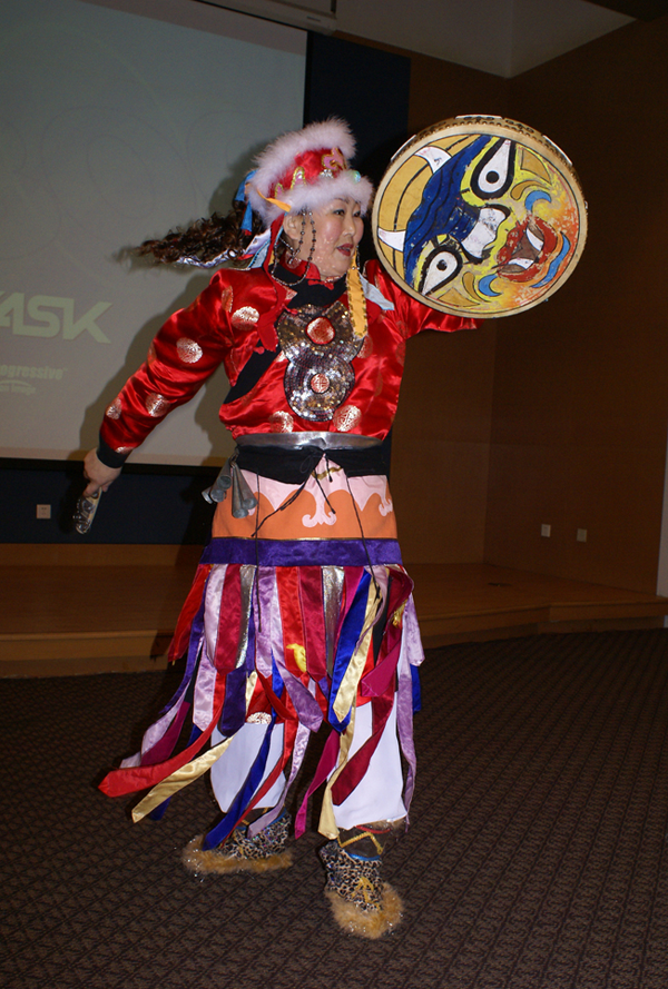 鼓是一種十分古老的打擊樂(lè)器,制作簡(jiǎn)單,使用范圍廣,因此在赫哲族中非常流行。民族學(xué)家凌純聲在20世紀(jì)30年代調(diào)查時(shí)發(fā)現(xiàn),赫哲人幾乎家家有鼓。在當(dāng)時(shí),赫哲族使用的鼓,可以大致地分為三類(lèi):薩滿(mǎn)用的橢圓形鼓、“阿哈瑪法”用的圓形鼓和普通人家用的鼓。前兩種鼓均為單面鼓,雖然其大小略有不同,而其用法大致相同,即主要用于宗教活動(dòng)和民間祭祀。這兩種鼓既是薩滿(mǎn)的法器,又可以當(dāng)樂(lè)器使用。無(wú)論是在薩滿(mǎn)跳神之時(shí),還是在每年的鹿神節(jié)之際,薩滿(mǎn)鼓都是為人們伴舞的主要樂(lè)器。普通人家的鼓比薩滿(mǎn)鼓小得多。