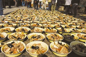 每年秋收后到翌年播種前,是四川涼山金陽縣人結(jié)婚的黃金季節(jié)。無論是在縣城還是農(nóng)村,不管是吃“九斗碗”,還是吃“坨坨肉”,大家都喜歡擺壩壩宴。在金陽縣城,常??梢钥吹竭@樣一幅景象:數(shù)百人聚在一處,圍坐于一張張方桌旁,伸箸暢食,舉杯暢飲。一盆盆肉端上桌子,主人不停地招呼客人趁熱吃?! ?/p>
