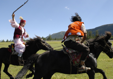 哈薩克族的傳統(tǒng)樂器可分為彈奏樂器、吹奏樂器以及打奏樂器。其中“冬不拉”、“薩孜”和“布特根”屬彈奏樂器;“斯伯孜俄”、“斯?fàn)柲且馈钡葘俅底鄻菲鳎弧斑_(dá)布拉”、“哈拉”等屬打奏樂器。無論是哪種類型的樂器無疑都將哈薩克族人民豪放灑脫,但又不失柔軟細(xì)膩的情感表現(xiàn)得淋漓盡致。哈薩克族的舞蹈剛健有力,瀟灑優(yōu)美,如“喀達(dá)卓日哈(黑走馬)”、“狗熊舞”、“鷹舞”、“擠奶舞”等都是反映哈薩克族人民日常生活的民族舞蹈。除歌曲、舞蹈以外,哈薩克族還有姑娘追、叼羊、賽馬等妙趣橫生的體育娛樂活動。