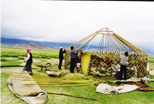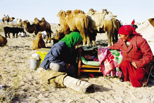 每戶人家的家就在那三四頭駱駝的背上,駱駝的先后排列也是有講究的。一般第一峰駱駝負責(zé)運被褥,婦女和小孩也坐第一峰駱駝。后面的駱駝則運衣服、日用品、食物、氈房的羊毛氈和氈房骨架。家里的男人們則騎著馬,趕著大群的牛羊緊跟在后面。平時來往較少的牧民們因為轉(zhuǎn)場,有了歡聚的機會。每天下午,牧民們就開始在路上安營扎寨,男人們開始從駝背上卸下氈房,在路邊搭建臨時簡易氈房;女人們生火煮飯,孩子們成群地奔跑嬉鬧,每家的牧羊狗或打架或形影不離。緩緩的炊煙在金色的黃昏中飄散,男人們開始圍在篝火旁喝酒唱歌,火光映紅每一張黝黑的臉龐,悠遠的歌聲在空曠的夜空飄蕩。