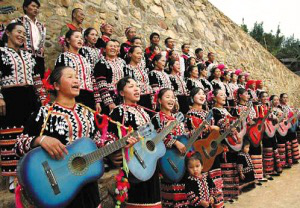 拉祜族是一個古老的民族,聚居在瀾滄江兩岸的云南臨滄、思茅地區(qū),有人口40余萬。如今,除了《婚誓》,還有一首更為流行的歌曲《快樂拉祜》,成為拉祜族的文化標(biāo)志?!犊鞓防铩返膭?chuàng)作者、拉祜族女歌手李娜倮的家鄉(xiāng),就是全寨四分之一人口都會彈吉他的“吉他之鄉(xiāng)”——云南瀾滄拉祜族自治縣酒井哈尼族鄉(xiāng)老達(dá)保寨子。